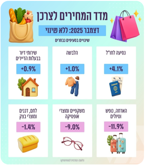 מדד המחירים לצרכן נותר ללא שינוי בחודש דצמבר לעומת חודש נובמבר 2025